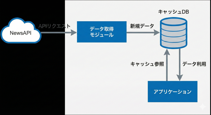 NewsAPIにはfromパラメータがあり、これを活用することで、指定した日時以降に公開されたニュースのみを取得できます。キャッシュDBに最終取得日時を記録しておくことで、この差分更新を効率的に実現できます。